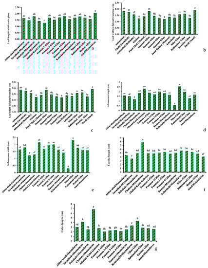 The water mint ecotypes collected from dissimilar ecological conditions showed significant differences in their leaf length-to-width ratio, and leaf length and width along the lateral branches (Table 2). The greatest leaf length-to-width ratio and leaf length and width along the lateral branches (2.04, 3.26, and 1.91 cm) were observed in Amol-Mazandaran, Abbas abad-Mazandaran, and Amol-Mazandaran ecotypes, respectively. The corresponding lowest values (1.27, 2.3, and 1.20 cm) were noted in the Aliabad Katol-Golestan, Chalous-Mazandaran, and Fouman 4-Gilan ecotypes where reductions of 60.69, 41.73, and 59.16% were recorded compared to the ecotypes with the highest values (Figure 4a–c). The results also revealed that the inflorescence length and width, corolla length, and calyx length in the different ecotypes were significantly influenced by geographical variation (Table 1). The longest and widest inflorescences (2.52 and 2.30 cm) were noted in the Niloo-Gilan ecotype, whereas the other extreme (0.40 and 0.30 cm) was observed in Kelardasht-Mazandaran (Figure 4d,e). Additionally, the greatest corolla and calyx lengths (7.87 and 6.85 cm) were measured in the Chalous-Mazandaran ecotype, and the least (3.55 and 2.01 cm) were found in the Savadkuh-Mazandaran and Fouman 1-Gilan ecotypes, respectively (Figure 4f,g).