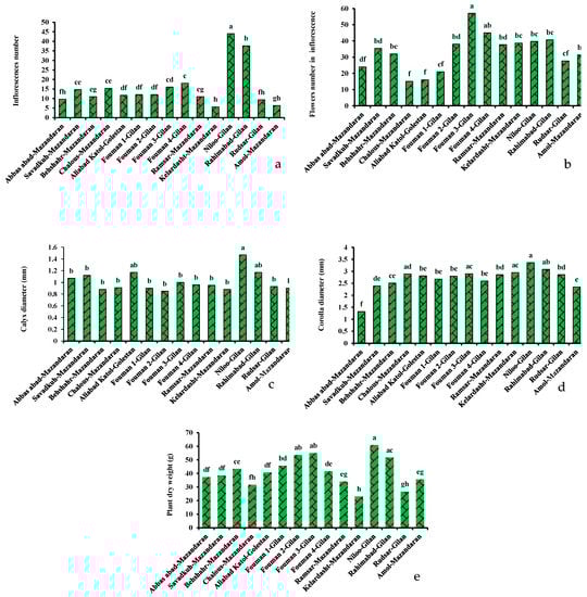 Mean comparison for inflorescence number (a), flower number in inflorescence (b), corolla diameter (c), calyx length (d), and plant dry weight (e) in different ecotypes of M. aquatica collected from the Hyrcanain hotspot of Iran. Different letters indicate significant differences according to the LSD test at p < 0.05.