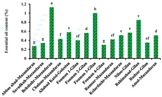 Essential oil concentrations of M. aquatica populations from the Hyrcanian hotspot of Iran. Different letters indicate a significant difference according to the LSD test at p < 0.05.