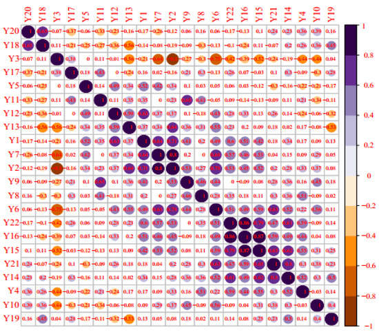 Heat map of Pearson’s correlation analysis for morphological traits in different populations of M. aquatia in the Hyrcanian hotspot of Iran. Heat map representing Y1: plant height, Y2: plant width, Y3: plant length /width ratio, Y4: main stem diameter, Y5: tnternode length, Y6: number of lateral branches, Y7: lateral branch length, Y8: collar diameter, Y9: leaf length, Y10: leaf width, Y11: leaf length-to-width ratio, Y12: leaf length on lateral branches, Y13: leaf width on lateral branches, Y14: inflorescence number, Y15: inflorescence length, Y16: inflorescence width, Y17: flower number in inflorescence, Y18: corolla length, Y19: corolla diameter, Y20: calyx length, Y21: calyx diameter, and Y22: plant dry weight.