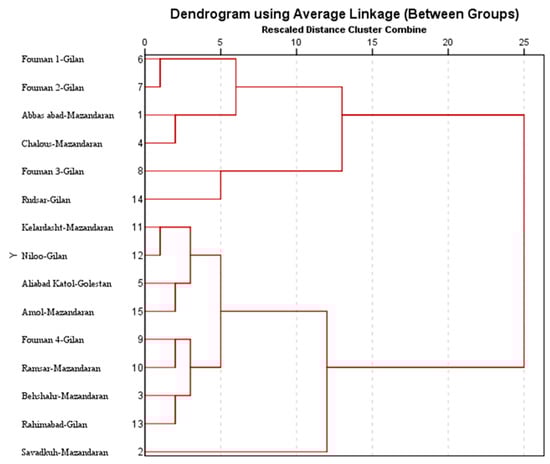 A cluster analysis for the morphological traits was performed based on the Ward method. It separated the 15 ecotypes into three main groups (Figure 8). Cluster I included Savadkuh-Mazandaran, Behshahr-Mazandaran, Abbas abad-Mazandaran, Chalous-Mazandaran, Aliabad Katol-Golestan, Rudsar-Gilan, Fouman 3-Gilan, and Fouman 4-Gilan. This cluster mostly consisted of relatively similar ecotypes in terms of the lowest mean values for such traits as the plant height and width, internode and branch length, leaf width, number of inflorescences, and calyx length. Cluster II contained Fouman 1-Gilan, Amol-Mazandaran, Ramsar-Mazandaran, Fouman 2-Gilan, Niloo-Gilan, and Rahim abad-Gilan. These ecotypes were similar in trait values for the plant height and width, main stem diameter, number and length of secondary stems, number of flowers and inflorescences, and dry weight.