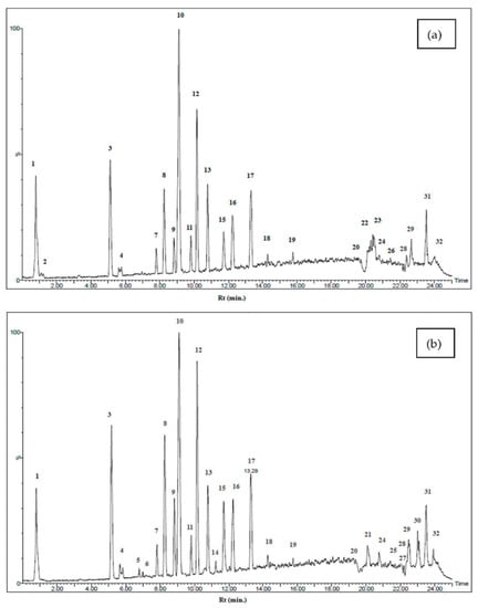 - Adams, R.P. Identification of Essential Oil Components by Gas Chromatography/Quadrupole Mass Spectroscopy, 4th ed.; Allured Publishing Corporation: Carol Stream, IL, USA, 2007; Volume 1, p. 456. [Google Scholar]