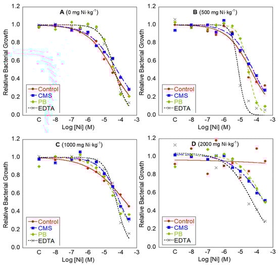 Dose–response curves of relative bacterial growth versus added Ni to bacterial suspensions from a polluted soil with four Ni levels: 0 (A), 500 (B), 1000 (C), and 2000 (D) mg Ni·kg−1. Each Ni level was remediated with four treatments: crushed mussel shell amendment (CMS, blue dots and line), pine bark amendment (PB, green dots and line), EDTA washing (black dots and line), and control (red dots and line).