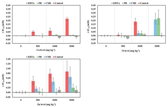 The soil amendment with CMS reduced the bacterial community tolerance to Cu, Ni, and Zn. The CMS addition was effective in decreasing Cu toxicity at all studied Cu levels in soil (∆IC50 decreased from 0.223, 0.066 and 0.054 mM to below 0.006 mM at 2000, 1000, and 500 mg·kg−1, respectively; Figure 4). Regarding Ni, CMS application reduced bacterial community tolerance to Ni at 1000 mg·kg−1 (∆IC50 decreased from 0.184 mM to 0.034 mM), while at 2000 mg·kg−1 bacterial communities were able to grow normally (R2 = 0.99, Table 1), but showing very high tolerance (∆IC50 = 0.214 mM). In the case of Zn, CMS application decreased bacterial community tolerance to Zn at 500 and 1000 mg·kg−1 (∆IC50 decreased from 0.474 and 0.781 mM to 0.156 and 0.450 mM, respectively) but not at 2000 mg·kg−1 CMS (∆IC50 decreased from 0.874 to 0.645 mM). The mode of action of CMS amendment to reduce the bacterial community tolerance to Cu, Ni, and Zn was to increase the soil pH, thus reducing the toxicity of metals [,]. Fernández-Calviño et al. [] determined an increase of at least 1 pH units at zero days of incubation after CMS amendment (48 g·kg−1) in a soil with pH 4.5, increasing with time. After 51 days of incubation with 48 g·kg−1, Fernández-Calviño et al. [] determined an increase of ≈2 pH unit in a pot experiment. Increased adsorption of Cu, Ni, and Zn after CMS application was showed by Fernández-Calviño et al. [], Garrido-Rodríguez et al. [], and Ramírez-Pérez et al. [], thus reducing the soluble and/or available metal content. Our results showed that in Ni-polluted soil with the highest metal level studied (2000 mg·kg−1), bacteria could not grow normally, but this tendency was reversed after CMS addition. CMS has the ability to increase Ni retention [], reducing Ni availability and allowing the development of bacteria. Hence, the CMS treatment was effective in reducing Cu, Ni, and Zn toxicity. At 1000 mg·kg−1, the greatest effect of CMS addition was on Cu toxicity which reduced the bacterial community tolerance by −91%, followed by Ni (−82%) and Zn (−42%) (Table S2, Supplementary Information). In this way, bacterial community tolerance to heavy metals seems a good indicator to evaluate the soil status, in terms of metal toxicity, after metal remediation.