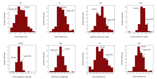 Tugela-DN and Elands are well-adapted cultivars with high yielding potential (Figure S1) and are extensively used for dryland wheat production in South Africa [58]. Released 30 and 24 years ago, respectively, Tugela-DN and Elands exhibit contrasting phenotypes for grain morphological characteristics; important agronomic traits such as aluminum tolerance and pre-harvest sprouting tolerance; and resistance to rust diseases [59,60], Table S1. Tugela-DN is a winter cultivar that meets the requirements of all the quality subclasses and is well adapted to all potential conditions. It has a shorter plant stature and has bigger seeds in contrast to Elands. Elands is a facultative cultivar with exceptional bread-making quality; it is used as a standard check for bread quality in the South African wheat industry. The DH population was developed by crossing Tugela-DN and Elands cultivars. After the production of F1 or F2 progeny, chromosome doubling was induced on plants that had undergone embryo rescue and the regeneration using tissue culture technique. The Tugela-DN × Elands DH population was developed specifically to evaluate for pre-harvest sprouting tolerance. However, it was noted that the population also segregated for plant height and yield component traits. Thus, the DH population was phenotyped in multiple environments to explore the genetic variability driving the performance and adaptation of these cultivars.