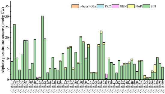 Of these nine glucosinolates, five belonged to aliphatic glucosinolates (Figure 3), namely, progoitrin, sinigrin, n-hexyl-GLs, gluconapin, glucobrassicanapin; and four belonged to indole glucosinolates (Figure 4), namely, 4-hydroxyglucobrassicin, glucobrassicin, neoglucobrassicin, 4-methoxyglucobrassicin. The total aliphatic glucosinolates ranged from 0.9950 to 30.3443 µmol/g DW, mainly sinigrin, which accounted for 17.92~100.00% of total aliphatic glucosinolates. However, the n-hexyl-GLs was only detected in JC 18-11 and 37, and we only detected one glucosinolate sinigrin in JC 18-08, 17, 19.