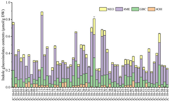 The total indole glucosinolates ranged from 0.1258 µmol/g DW to 0.8896 µmol/g DW, mainly 4-methoxyglucobrassicin, which accounted for 33.72~84.05% of total indole glucosinolates. According to the results, almost 1/3 of the genotypes did not contain the compounds 4-hydroxyglucobrassici, and the neoglucobrassicin was not detected in JC 18-06, 08, 15.