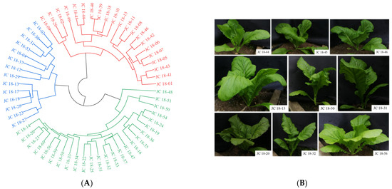 (A) cluster analysis of mustard resources based on the different performances of 30 agronomic traits. The distance matrix was grouped using the unweighted pair-group method with arithmetic mean after the Euclidean distance coefficients among the columns of the data matrix were calculated. The tested materials were clustered into three groups at the genetic distance of 56.7; and (B) morphological characteristics of some mustard resources.