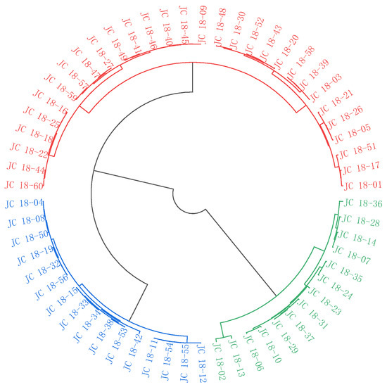 Based on the analysis of phenotypic traits, the 60 mustard resources were classified into three groups (Figure 5). Group I (red) consisted of 21 resources, which were mainly characterized by high plant height, large plant width, broad elliptic leaf shape, full cleft, spreading plant type, green petiole color and flower stem color. There were 14 resources in group II (blue), which were mainly characterized by medium plants, small plant width, broad elliptic leaf shape, full cleft, semi-erect plants, light green petiole color and flower stem color. Lastly, there were 25 resources in group III (green), which were mainly characterized by short plants, large plant width, wide petiole, elliptic leaf shape, no cleft, semi-erect plant type, green petiole and flower stem color. The resources in Beijing were distributed in group I and group II, and mainly in group I, Hunan were mainly distributed in group II and group III, and Fujian were mainly distributed in group I and group III, while Guangxi were mainly distributed in group III.