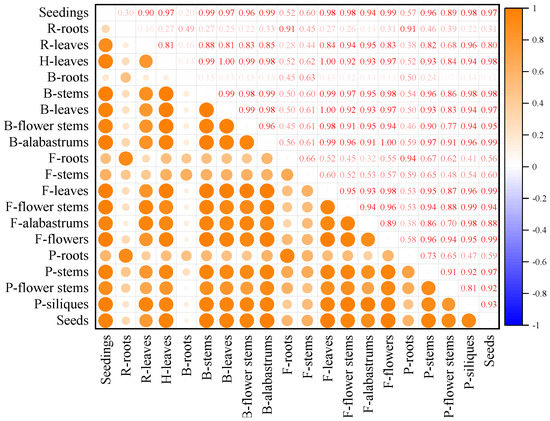 Correlation analysis of different parts in different growth stages of mustard resource JC 18-56. (R: rosetting phase; H: harvesting phase; B: bolting phase; F: flowering phase; P: pod−setting phase). The orange color in the graph represents positive correlation, and the blue color represents negative correlation. The color is darker, the correlation is stronger.