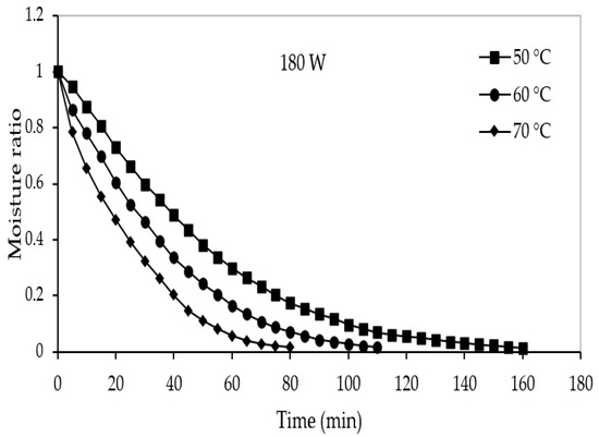 Figure 1 shows the variations in the MR of the pumpkin slices vs. the drying time for various powers. Examining Figure 1 shows that there is no constant drying speed stage in the drying process of pumpkin layers and that the whole drying process takes place in the period of decreasing drying speed. This shows that the physical phenomenon of diffusion is the most likely driving effect of moisture escape. It can be seen that in the initial stages of drying, the slope of the drying speed is high and that in the later stages, this slope decreases. The reason for this could be the high amount of moisture released in the initial stages of the drying process. With the passage of time, the humidity of the product decreases, and then the amount of moisture released from the product decreases; then the drying speed of the pumpkin layers decreases, and then the drying time increases, which can be seen in the final stages of the drying process. By comparing Figure 1, it can be seen that the drying time decreases with the increase in temperature, which can be due to the increase in the movement of water molecules in the product due to heat and the increase in its evaporation rate [26].