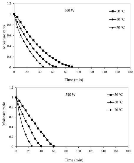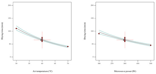 Figure 2 shows the individual effect of each independent variable (air temperature and micro-wave power) on drying time. With increasing air temperature or microwave power, the drying time exhibits a decreasing trend. These findings are consistent with previous studies on drying papaya [17], mushrooms [19], tomato [26], and white mushrooms [38]. Higher temperatures lead to the rapid loss of free water in the samples, i.e., the product dries in a shorter time. This phenomenon can be assigned to the increase in the thermal gradient inside the samples [38]. Increasing microwave power also reduces the drying time due to the larger vapor pressure difference between the surface and the interior of the pumpkin with the penetration of microwave energy [20].