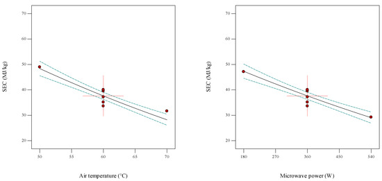 Therefore, the SEC of the hybrid MHD (SECMic-Con) can be determined by summing the SEC values of the convection (SECCon) and microwave drying (SECMic) based on Equation (4) [28]: