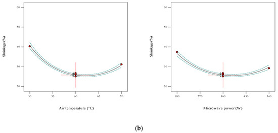 Figure 4a depicts the combined effect of air temperature and microwave power on shrinkage, which first decreases followed by an increase. The product will experience more shrinkage at fast mass transfer processes, which is generally due to the pressure imbalance between the internal and the external pressures of the material when the water exits the food, leading to the deformation of the product and sometimes its cracking [46,47].