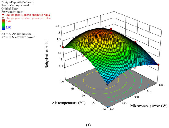 According to Table 10, which presents the ANOVA results for RR, the linear and quadratic relationships of air temperature and microwave power were significant to RR (p < 0.01). For microwave power, only the linear relationship was significant with RR. The combined effect of the air temperature and microwave power with the dependent variable of RR is depicted in Figure 6a; the combined effect of these two factors was not significant on RR as it first increased followed by a decline. The increase in RR with the increase in microwave power may have been due to the high pressure in the empty space of the dried pumpkin samples as a result of high microwave power. The evaporation of internal water by absorbing microwave energy and the creation of pores in dried pumpkins prevent volume contraction and the hardening of the samples, thus increasing the RR [54]. These results are consistent with the reports of Kumar and Shrivastava [55] and Zahoor and Khan [20]. However, when the microwave power exceeded 360 W, the RR decreased due to the damage to the cell structure caused by the excessive microwave power. RR first rose with the increase in air temperature, suggesting that the increase in temperature in the lower levels enhances the water evaporation rate from the surface and the pressure gradient between the inside and the surface of dry materials. Increasing the pressure gradient helps the rapid escape of water from the inside to the surface and improves the RR by forming some capillary channels [56]. However, temperature increase beyond 60 °C led to excessive dehydration, structural destruction, severe volume contraction, and the hardening of the material and thus worse rehydration ratios [57].