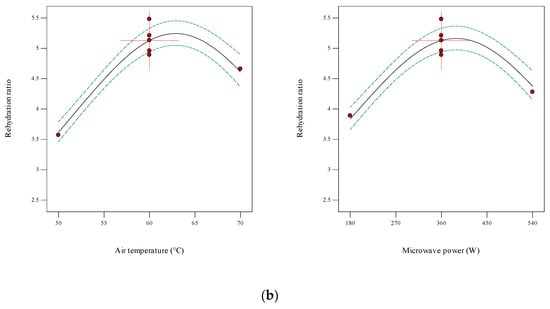 According to Figure 6b, RR increased with increasing temperature from 50 to 60 °C and then decreased with further increase in temperature from 60 to 70 °C. Regarding the effect of microwave power on RR, an increase in microwave power from 180 to 360 W led to an upward trend, which turned into a descending trend with the further elevation of microwave power from 360 to 540 W. The highest RR is shown in Figure 6b for each of the factors. Specifically, the highest RR was for samples dried at 60 °C and a microwave power of 360 W. Li et al. [19] investigated the drying of mushroom slices in convective and microwave dryers. They observed the highest RR coefficient at 60 °C and microwave power of 2.49 W/g. They also showed that an increase in the temperature from 40 to 60 °C increased the RR, which then decreased with the further elevation of air temperature from 60 to 80 °C. Power levels above and below 2.48 W/g exhibited lower RRs, which is consistent with the results in this research. A similar trend was also reported for drying purple cabbage by Liu et al. [51].