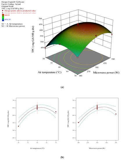 Figure 7a shows the combined effect of air temperature and microwave power on the TPC. According to part a, their combined effect on the TPC is not significant, as it first showed an upward trend followed by a descending one. Better preservation of TPC was achieved by increasing the microwave power and temperature, which could be attributed to the faster and shorter heating of the product due to high power and temperature, resulting in better TPC preservation. Horuz et al. [52] investigated the TPC of dried sour cherries using a convective dryer and a hybrid MCD and reported a higher loss of polyphenols in the convective dryer, which might be due to the degradation of phenols in the long-term exposure of the product to temperature. However, under different drying methods, phenolic compounds are mainly dependent on the composition and stable changes of these compounds at various drying conditions. Moreover, heating destroys oxidative enzymes, thus helping preserve more phenolic compounds [58].