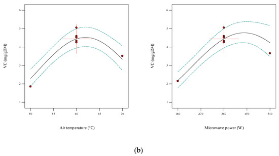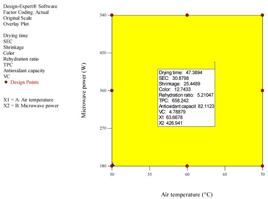 The response surface method was employed to optimize drying conditions in terms of the effects of the independent variables (air temperature and microwave power) on the dependent variables (drying time and SEC, RR, color and shrinkage, AC, TPC, and vitamin C). Experiments were carried out according to the central composite design (CCD) using Design Expert software at three levels for each independent variable (Table 1). The optimal points were separated based on the desirability index, and the highest predicted index represents the best conditions for pumpkin drying. In this study, the common second-order model used in the response surface method is described according to Equation (10) [25,27]: