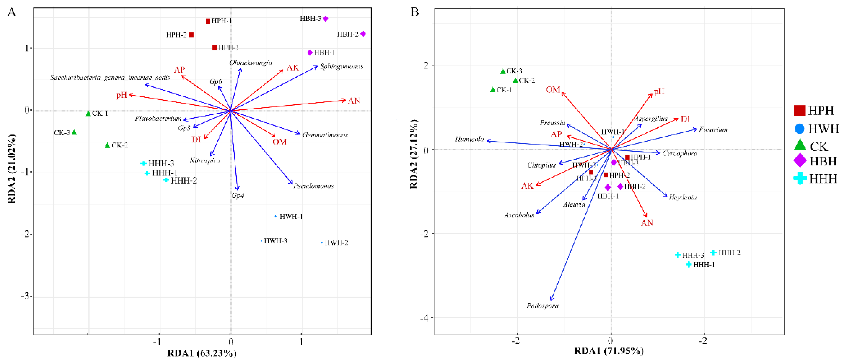 3.6. Correlation of Physicochemical Properties with Microbial Diversity