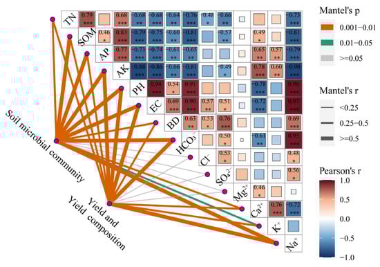 Mantel analysis of the soil microbial structure, grain yield, and yield components in response to environmental factors. The labels indicate significant levels tested by Pearson correlation (* p < 0.05, ** p < 0.01, *** p < 0.001).
