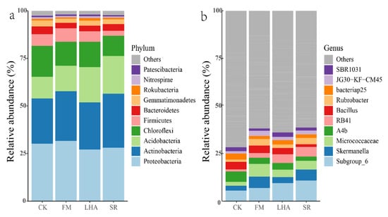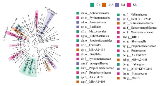 Variations in the dominant bacterial phyla between treatments were evident. The proportion of Acidobacteria in the SR treatment was significantly increased to 22%, while the corresponding proportion in FM and CK was significantly decreased to 13% and 11%, respectively; however, the proportion of Firmicutes in the SR treatment was significantly decreased to 3% (Figure 2a, Table S1). At the genus level, organic material treatments significantly increased the abundances of Subgroup_6, Skermanella, Micrococcaceae RB41, Rubrobacter, and JG30-KF-CM45 (Figure 2b). Furthermore, linear discriminant analysis indicated that the number of genus biomarkers varied between treatments (Figure 3), with RB41 in SR; Skermanella, Rubrobacter, Blastococcus, and JG30−KF−CM45 in FM; MB−A2−108 and MND1 in LHA; and Propionibacteriaceae and AKYG1722 in the CK treatment.