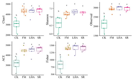 To investigate whether soil microbes are involved in plant growth and affect changes in soil properties after organic amendment application, soil bacterial communities were analyzed by high-throughput sequencing of 16S rRNA gene amplicons. Among the alpha diversity indexes, the Shannon index, Chao1, ACE diversity, and the richness index in organic amendment treatments were significantly higher than those in CK (p < 0.05) (Figure 4). Furthermore, the LHA, FM, and SR treatments exhibited higher degrees of variation in their rarefaction curves than did the CK treatment (Figure S3).