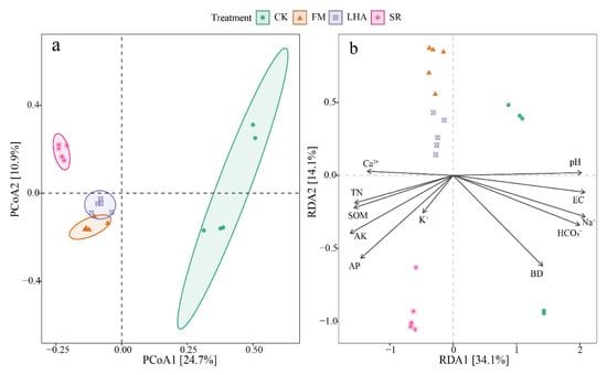The correlation analysis of soil environmental factors and microbial community structure showed that the soil TN, SOM, AP, AK, pH, EC, BD, SAR, HCO3−, Ca2+, K+, and Na+ concentrations had a significant effect on bacterial community structure (p < 0.05) (Figure 1). RDA further revealed the relationship between the soil bacterial community structure and environmental variables. The results of RDA analysis showed that the first and second ranking axes explained 27.7% and 11.8% of the microbial community structure variation, respectively, and physicochemical factors had different effects on soil microbial community structure (Figure 5b). With significant effects, pH, EC, BD, and HCO3− were positively correlated with the microbial community structure of the control soil, while TN, SOM, AP, AK, Ca2+, and K+ were positively correlated with the soil microbial community structure in the organic amendment treatments.