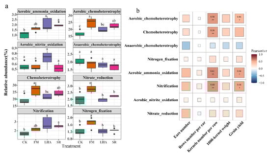 Functional prediction of bacterial groups in the different treatments using FAPROTAX. Different letters indicate significant differences between the different treatments at the p < 0.05 level (a); Pearson correlation analysis of the functionally predicted abundance of bacterial communities with yield and yield components (b). The labels indicate significant levels tested by Pearson correlation (* p < 0.05, ** p < 0.01).