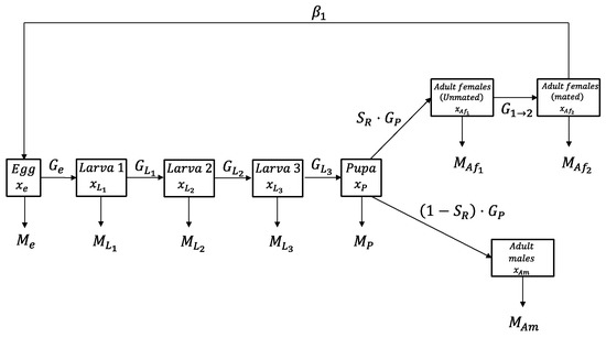 First, we need to know the number of stages that comprise the B. oleae life cycle. Each “identifiable” stage (i.e., the stages taxonomically defined) has an associated state , whose dynamics are described by an Ordinary Differential Equation (ODE). Accordingly, the whole life cycle is schematized by a system of chained ODEs. Based on biological information, B. oleae has an egg stage , three larval instars , , and , a pupa stage , an adult male stage , and two adult female stages: the non-mated females and the mated females .