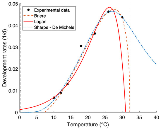 A preliminary screening was carried out to roughly check the best candidate functions. To not divert the attention from the main purpose of this work we only reported the development rate functions that provided the most interesting results for B. oleae, according to the literature data available.