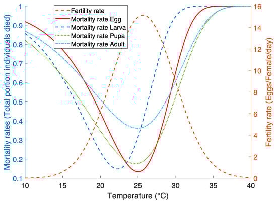 Following the logic line of the previous sections, temperature-dependent fertility was modeled using the same Gaussian-like function that Ryan et al. [62] applied to D. suzukii: