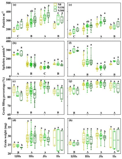 | Spikelets panicle−1 | ns | ns | ns | ** | ** | ns | ** | ns | ns | ns | ns | ns |