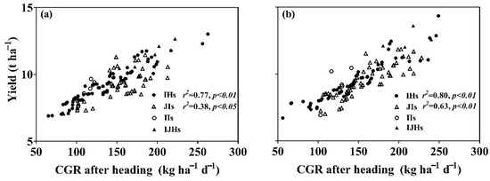 - Takai, T.; Matsuura, S.; Nishio, T.; Ohsumi, A.; Shiraiwa, T.; Horie, T. Rice yield potential is closely related to crop growth rate during late reproductive period. Field Crops Res. 2006, 96, 328–335. [Google Scholar] [CrossRef]