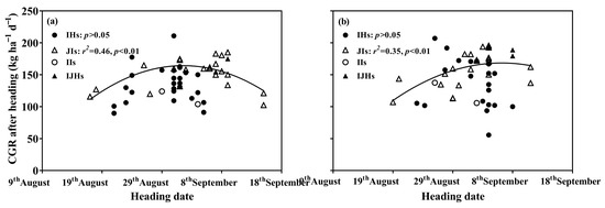 APA StyleDing, C., Zhu, X., Xu, C., Cambula, E., Lu, B., Luo, X., Wu, Q., Zhong, Q., Xu, X., Liu, Z., Ding, Y., Yang, J., & Li, G. (2022). Yield Potential of Machine-Transplanted Rice and Correlation of Crop-Growing Rate during Grain-Filling Stage. Agronomy, 12(10), 2299. https://doi.org/10.3390/agronomy12102299