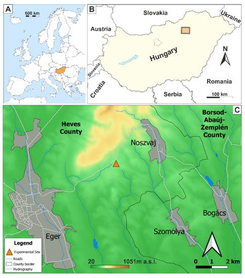 The Síkfőkút DIRT Project research area (Hungary). (A) Hungary in Europe; (B) Síkfőkút Proejct in Hungary; (C) Location of Síkfőkút Project.