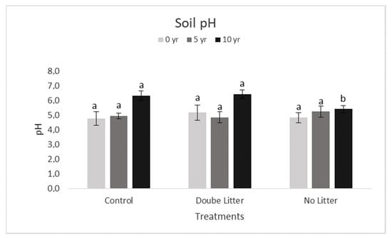 At the beginning (p = 0.642) and 5 years after the start of the treatments (p = 0.552) there was no significant difference in the pH values of the examined treatments. After 10 years, compared to Co (pH = 6.32), the pH of the NL (pH = 5.41) treatment shifted to a more acidic direction (Figure 2). The decreasing litter input lowered the pH of the soil. This can be explained by the fact that the acid intermediates and humic substances produced during litter decomposition cannot be sufficiently buffered by the decreasing basic cation content of the decreasing litter input [39,40]. Similar results were experienced by [41] when, after forest clearcutting, they found that after the reduced litter input, the organic matter content of the soil began to decompose rapidly and the pH also changed in an acidic direction due to the change of cation/anion conditions in the soil. Due to the higher basic cation content dissolution and larger buffer capacity associated with a larger liter intake, we would have expected that the pH in the DL plot would be more basic compared to Co. On the other hand, in the DL treatment (pH = 6.41), the pH of the soil developed similarly to Co (Figure 2).