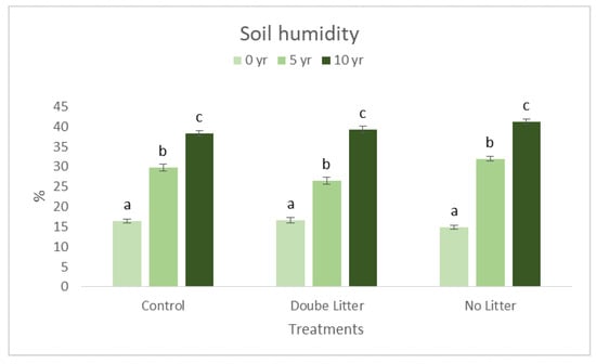 Soil moisture at the start of the treatments and after 5 and 10 years, based on spring measurements (Average of 6 samples per treatment; Letters indicate the significant difference between treatments within the same sampling time.).