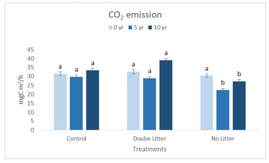 A certain time must elapse between litter manipulation and the appearance of changes in the stock and dynamics of organic matter, which depends on the characteristics of the area (speed of decomposition, ability to bind soil particles) [44]. In the beginning, there was a higher CO2 emission in the litter removal plots after their establishment because the remains of plant roots left in the soil during their decomposition served as an easily available and easily usable nutrient source for the microorganisms, similar to the studies of [45]. However, Sulzman et al. [24] reported that shortly after treatment, microorganisms in the root zone quickly go to the dormant stages if they do not have a sufficient source of nutrients. As a result of the treatment, the litter accumulates in the upper of the soil, the activity of the microorganisms does not immediately follow the rate of this accumulation, therefore, in contrast to the litter withdrawal, the effect of the excess organic matter did not prevail during the spring investigation (Figure 4).