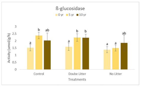 In the case of the β-glucosidase enzyme (Figure 5), spring activities increase because this is when the degradation of the previous year’s litter becomes more intense as a result of the rising temperature. Under the experimental conditions we used, the temperature does not play the main role in the development of enzyme activity (similar results were obtained by [46] for arylsulfatase and sucrose), but we could not demonstrate a significant relationship with average soil moisture in the initial period either. The activity of the ß-glucosidase enzyme (Figure 5) developed similarly to the trend observed in soil respiration 5 and 10 years after the establishment of the plots. As a result of the correlation analysis, no significant relationship can be detected between the two measured variables (ß-glucosidase enzyme and soil respiration) (p > 0.050, R = 0.213).