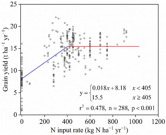 | China | winter wheat–summer maize | 405 | 15.5 | linear-plateau | 288 | This study |