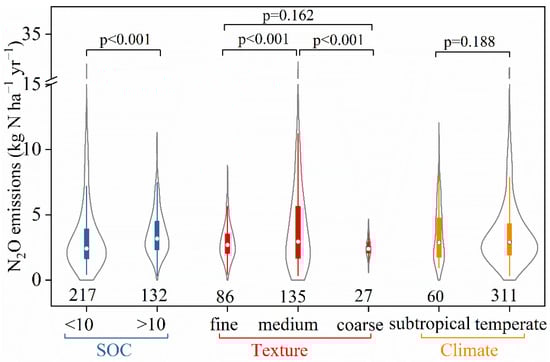 - Gu, J.; Zheng, X.; Wang, Y.; Ding, W.; Zhu, B.; Chen, X.; Wang, Y.; Zhao, Z.; Shi, Y.; Zhu, J. Regulatory Effects of Soil Properties on Background N2O Emissions from Agricultural Soils in China. Plant Soil 2007, 295, 53–65. [Google Scholar] [CrossRef]