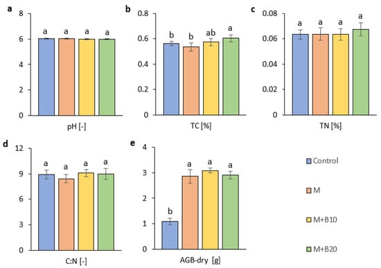 There were no significant changes in soil pH observed after the application of amendments, namely, manure (M), manure + biochar 10% (M + B10), and manure + biochar 20% (M + B20). In all cases, the effect of applied amendments remained statistically non-significant among each other and with control (Figure 1a). The application of M + B20 resulted in the highest total carbon (TC), which was statistically significant compared to control (Figure 1b). This trend was followed by M + B10 and M alone treatments, but they remained statistically non-significant relative to control (Figure 1b). Conversely, there was no clear trend observed for TN contents under the applied amendments (Figure 1c). In the same way, there were no significant differences observed for C:N under the applied amendments (Figure 1d). The application of M + B10, however, yielded a slightly higher C:N ratio compared to other amendments and in the control (Figure 1d). The aboveground plant dry biomass (AGB-dry) was differently affected with the applied amendments. Seemingly, the application of M + B10, M + B20, and M alone resulted in similar increases in AGB-dry as compared to control soil (Figure 1e).
