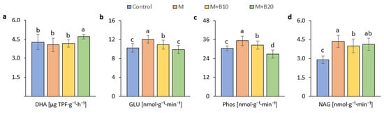 All three amendments yielded variable results regarding different soil enzyme activities. Dehydrogenase activity (DHA) was significantly higher in the soil amended with M + B20 compared to other amendments and the control, while the effects of other amendments remained statistically non-significant to the control (Figure 2a). The β-glucosidase (GLU) activity was significantly higher in the soil amended with M alone than in the soil amended with M + B10 and M + B20, respectively (Figure 2b). Likewise, the soil amended with M showed a significantly higher value for phosphatase (Phos) activity compared to control and other amendments. In the case of urease, the application of M and M + B20 treatments yielded similar values, both of which were significant compared to control and M + B10 as well (Figure 2c). The M treatment also enhanced the activity of N-acetyl-β-d-glucosaminidase (NAG), followed by M + B20 and M + B10 compared to control (Figure 2d).