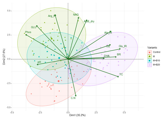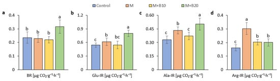 Surprisingly, the application of M + B20 resulted in the highest basal respiration (BR), which was significantly different than other treatments and control (Figure 3a). Considerable differences were observed for various substrate-induced respirations subjected to different amendments. Specifically, in line with the results of BR, the amendment of soil with M + B20 also enhanced the glucose-induced soil respiration (Glu-IR) and alanine-induced (Ala-IR) which were statistically significant compared with other amendments and control treatment (Figure 3b,c). This was followed by M and M + B10, but the effect of the M + B10 amendment remained non-significant compared to control (Figure 3b,c). Conversely, in the case of arginine-induced respiration (Arg-IR), the significantly highest values were recorded in soil amended with M compared to control. However, the amendment of soil with M + B10 and M + B20 yielded similar but statistically significant differences from control (Figure 3d). The association of Arg-IR in M treatment as shown by PCA further supports this result (Figure 4).