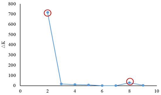 The statistic ΔK value for each given K in the population structure analysis.