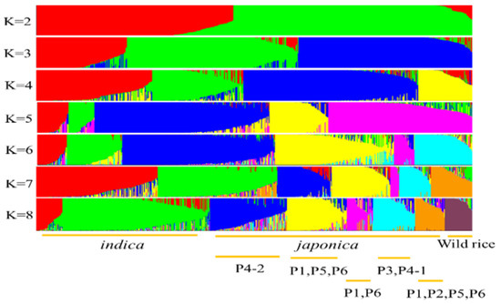 To further study the population structure of the 640 rice landraces, a Bayesian analysis was performed using STRUCTURE v2.3.4 [30]. Following a method proposed by Evanno et al. [36] to detect natural population clustering, we determined the number of subgroups within each population. There were two distinct peaks in the ΔK graph at K = 2 and K = 8 (Figure 3), supporting the division of the population into two or eight subgroups. When K = 2, the population was divided into two subgroups: japonica and indica; at K = 8, the results were consistent with those of the NJ tree. The Indica accessions were not further separated by region, whereas the japonica landraces from P3, P4-1, and P4-2 were clearly distinguished, and other accessions were clustered together with those from other regions (Figure 4). The results from NJ clustering and the STRUCTURE analysis indicated that the population structure was significantly different for japonica landraces from P3, P4-1, and P4-2 compared to other regions. The analysis suggested that this was related to the traditional food cultures of the ethnic minorities living in these regions.