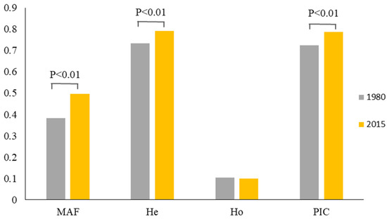 Comparison of the genetic diversities between populations collected in 1980 and 2015. MAF, major allele frequency; He, gene diversity; Ho, heterozygosity; and PIC, polymorphic information content.