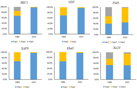 The haplotype numbers of rice landraces from 1980 and 2015 were 6, 4; 7, 5; 8, 5; 4, 2; 4, 4 and 9, 7 at the SKC1, GS5, Pid3, SAP8, Ehd1, and Xa23 gene loci, respectively (Figure 6). A total of 73.0% of the haplotypes were retained in the rice landraces from 2015, and most were dominant haplotypes. Moreover, four rare haplotypes (Hap5 of Ehd1, Hap8 and Hap10 of Pid3, and Hap8 of GS5) were newly developed, suggesting the original dominant haplotypes were well-maintained after short-term selective domestication by minorities.
