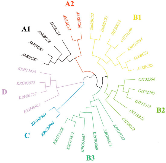The genome-wide identification of peanut RBCS genes was conducted using Rubisco_small and Rubisco_S Pfam with Hmmserach software. After the filtering of redundancy sequences, a total of eight RBCS genes were identified, and renamed from AhRBCS 1 to AhRBCS 8 according to their positions in the chromosomes (Table 1). The physicochemical property analysis showed that the molecular weight of AhRBCSs ranged from 17.595 to 25.538 kDa. The pI values were more than 8.6, indicating that all AhRBCS were basic proteins. An evolutionary tree was constructed using the RBCS amino acid sequences of Arachis hypogaea, Glycine max, Zea mays, and Nicotiana tabacum (Figure 1). All RBCSs were classified into four groups with seven subgroups (A1, A2, B1, B2, B3, C, D). Most AhRBCSs were assigned to group A while AhRBCS1 and AhRBCS5 were classified in subgroup B1.