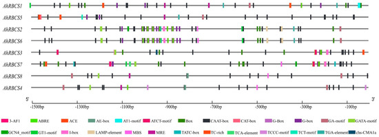 With the online Gene Structure Display Server (GSDS: http://gsds.gao-lab.org, accessed on 7 May 2021), the AhRBCS family gene characteristics and secondary structures were identified. The Multiple Em for Motif Elicitation (MEME) V5.4.1 program (https://memesuite.org/meme/tools/meme, accessed on 7 May 2021) was employed to characterize the AhRBCS conserved motifs, with the number of motifs set to 10. In addition, 1.5 kb upstream of the promoter regions was selected from the Ensembl Plants database and submitted to PlantCARE (http://bioinformatics.psb.ugent.be/webtools/plantcare/html/, accessed on 7 May 2021) for AhRBCS cis-acting regulatory elements (CREs) analysis. Then, the distribution of CREs on AhRBCS was mapped online by GSDS.